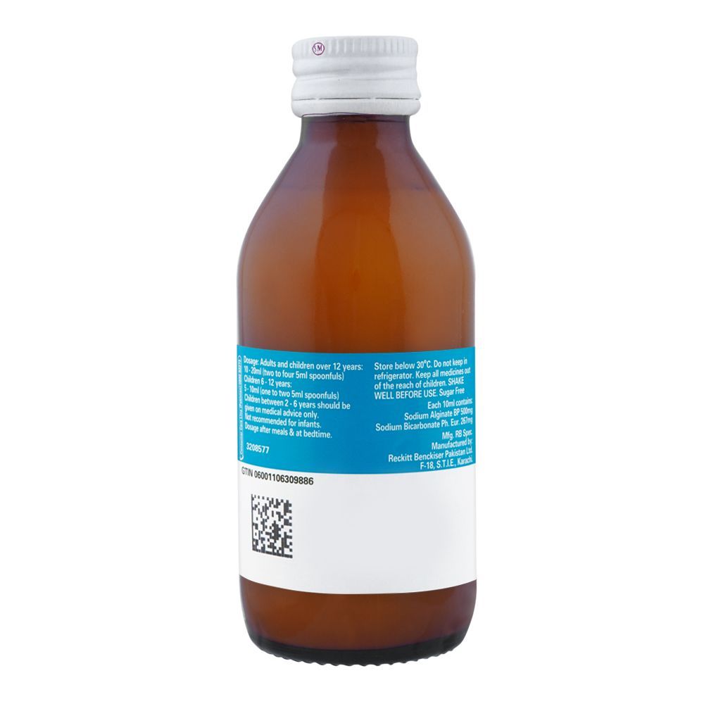 Gaviscon Liquid (Sodium Alginate + Sodium Bicarbonate) is an antacid used to treat acid reflux and heartburn. It works by forming a protective layer on top of the stomach contents to prevent acid from coming up into the esophagus.