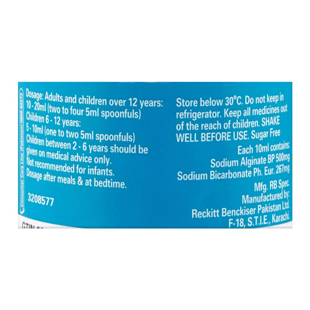 Uses Gaviscon Liquid (Sodium Alginate + Sodium Bicarbonate) is an antacid used to treat acid reflux and heartburn. It works by forming a protective layer on top of the stomach contents to prevent acid from coming up into the esophagus. Side Effects Generally well-tolerated. Some individuals may experience minor digestive discomfort. Caution Shake well before…